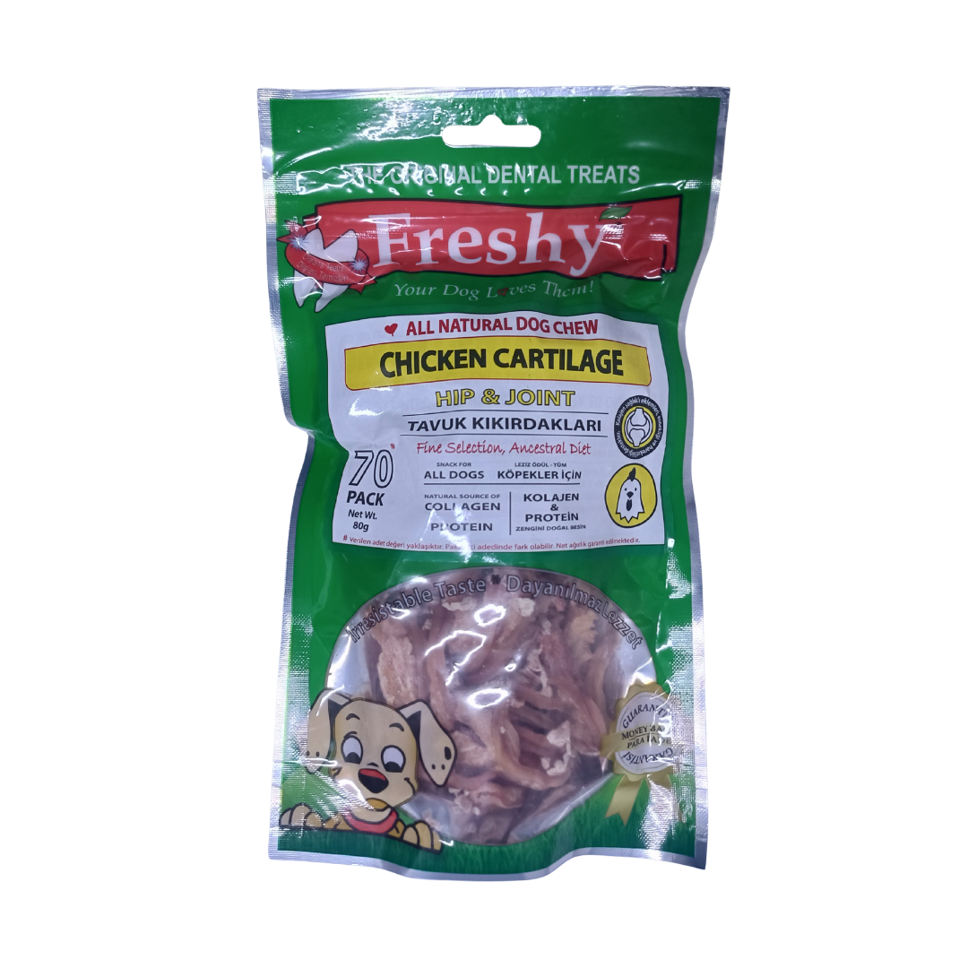- Doğal İçerik: Freshy Chicken Cartilage, katkı maddesi, koruyucu ve yapay aromalar içermez. %100 doğal tavuk kıkırdağı ile hazırlanmıştır.