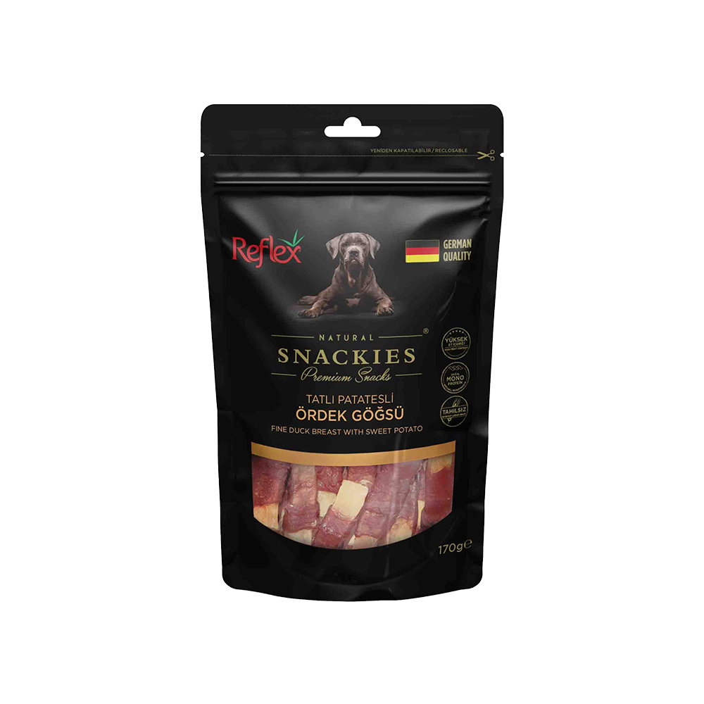 Reflex Snackies Natural Patatesli Ördek Göğsü Tahılsız Köpek Ödül Maması, dört ayaklı dostlarınız için özel olarak formüle edilmiş, sağlıklı ve lezzetli bir atıştırmalıktır. Özel bileşenleri sayesinde hem lezzet hem de besin değerleri açısından zengin bir ürün sunar.